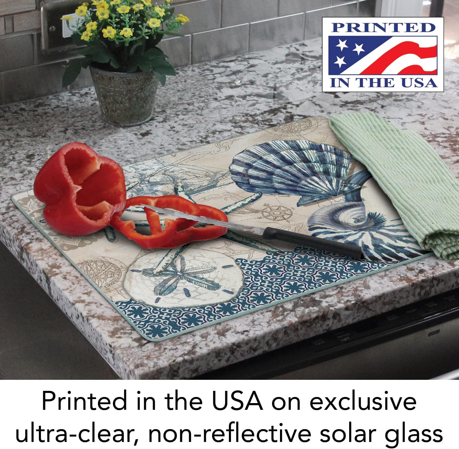 Perfect for prepping, cutting or serving, this glass cutting board from Counter Art features a sturdy tempered glass body that is shatter-resistant, and will prove to be a great counter saver. The hygienic, non-porous surface also resists stains, scratches and bacteria. The colorful, artistic design brings a distinctive style to your kitchen or buffet table. Non-skid feet on the bottom of this piece will hold the piece steady, and protect your countertop from scratches. Measures 15 by 12 inches. Dishwasher safe.