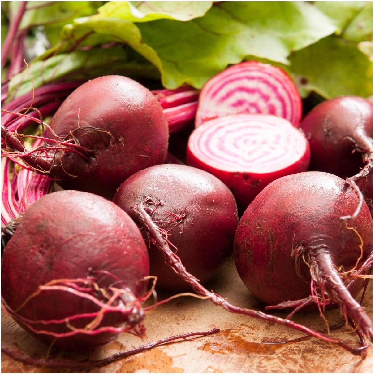 This striking Italian heirloom beet has alternating red and white rings running through its roots. When baked whole and sliced just before serving, this sweet variety retains its unique markings. The roots have an excellent sweet flavor! Tops are green with pink-striped stems and mild. It has approximately 60 days to maturity.
