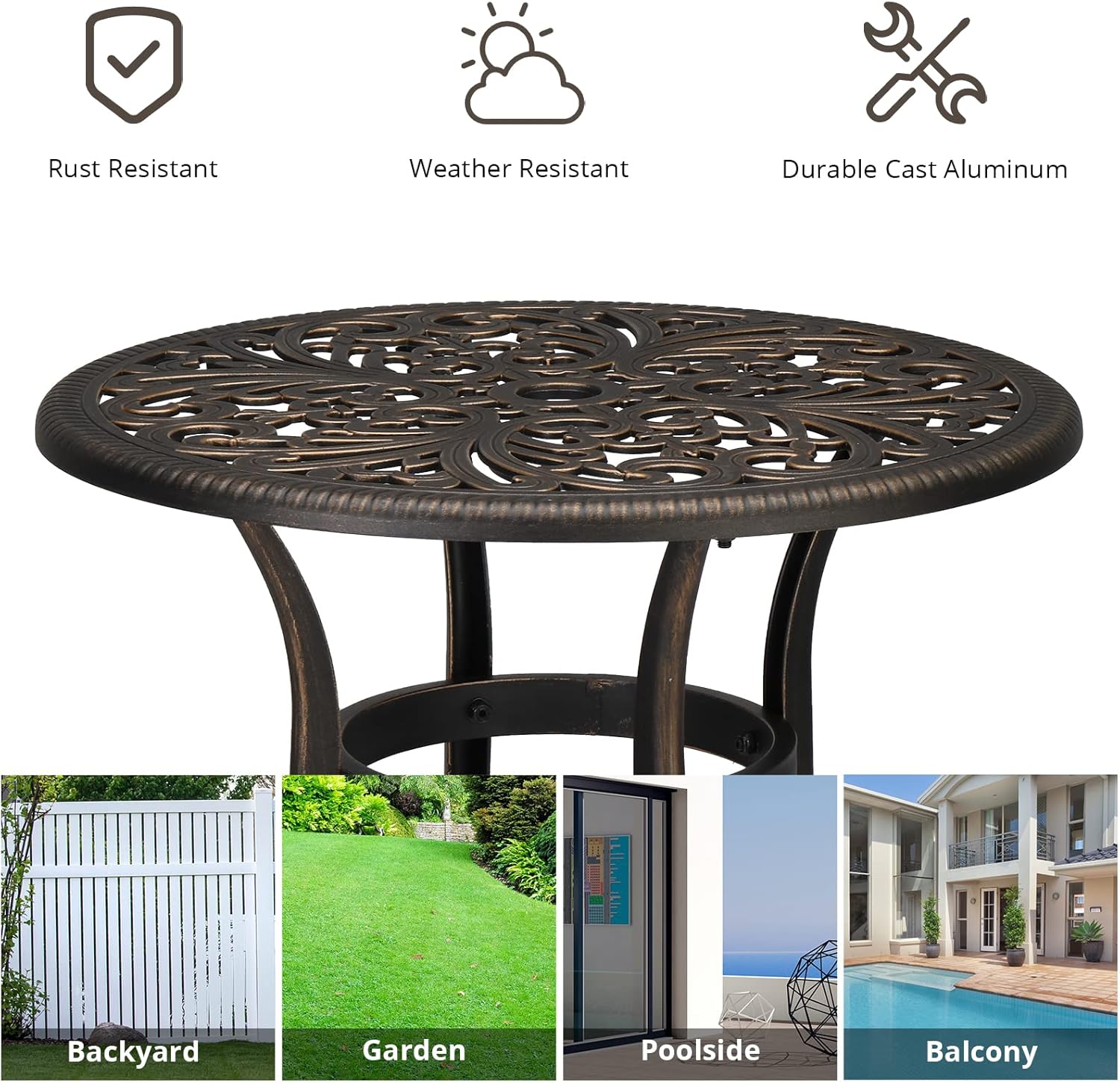 Introductions: How about spending a relaxing afternoon with your friend in your garden? All you need is a nice cup of coffee and a dining table. We recommend this 23.6inch Phoenix Table Round Garden Cast Aluminum Table for you. This iron table is more durable than regular table. That makes our tables against severe weather and ensure longer service life. The powder coated steel iron smooth, which can be quickly wiped. Useful and good looking, this table will not disappoint you. Features: 1. More durable than ordinary table 2. Easy to assemble, moment to clean with wet cloth 3. It's attractive, with nice coating and color 4. Suit to put it outdoors and indoors 5. Special material against severe weather and ensure longer service life Specifications: 1. Material: Aluminum 2. Color: Bronze 3. Product Size: Overall Size: 23.6*23.6*20.7" Fixed Round Frame Diameter: 28cm Fixed Round Frame Size: 3.5*1.3cm Umbrella Hole Diameter: 5cm Foot Height: 51.5cm Adjust The Foot Pad Size: Height 1cm, Screw Length 1cm 4. Load Capacity: 50kg/111lbs 5. Weight: 3.7kg Package Includes: 1 x 60cm Diameter Bronze Round Phoenix Side Table 1 x Hardware Assembly Accessories 1 x English Instruction Manual