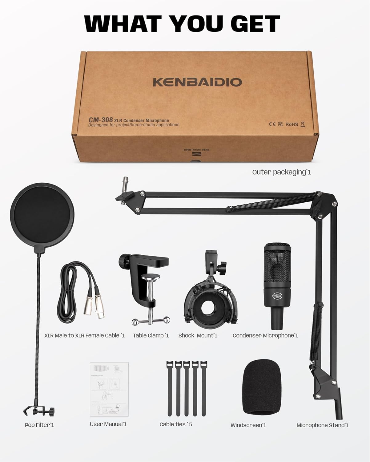 | BuiltIn Media | 1 Year Warranty, Metal Desktop Stand, Pop filter, Windscreen, User Manual, XLR Condense Microphone, XLR to XLR cable |